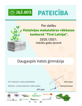 “Zaļā josta” sadarbībā ar SIA “Līgatnes papīrs”, SIA “Balticfloc”, SIA “AP Kaudzītes”, AS “Latvijas valsts meži”, SIA “Pilsētvides serviss”, "Lautus vide" PS un Valsts izglītības satura centru arī šajā 2020/2021. mācību gadā aicināja Latvijas pirmsskolas, vispārējās, interešu un profesionālās izglītības iestādes iesaistīties makulatūras vākšanas konkursā “Tīrai Latvijai!”, vācot makulatūru un sacenšoties ar citām Latvijas izglītības iestādēm savāktajā makulatūras apjomā.