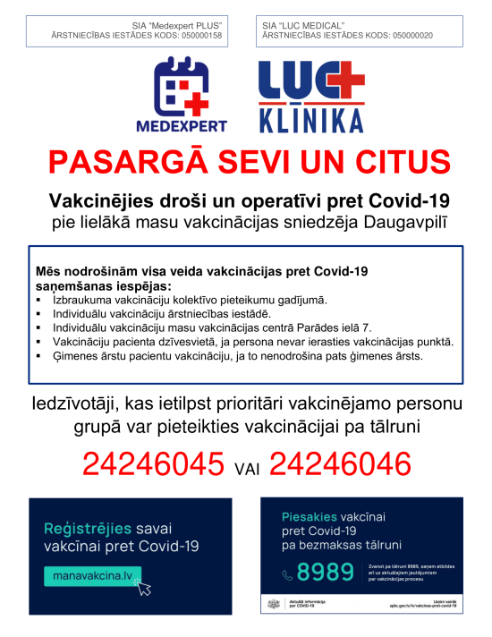 Всех жителей Латвии приглашают сделать прививку от Covid-19. Вакцинация позволит защитить себя и других людей, снизится риск распространения болезни на других членов семьи, одноклассников, коллег, друзей, соседей и других членов общества с ослабленным иммунитетом: маленьких детей грудничкового возраста, пожилых людей, больных раком и тех, которым нельзя пройти вакцинацию по медицинским показаниям. Вакцинация может предотвратить распространение заболевания и снизить количество новых инфекций.