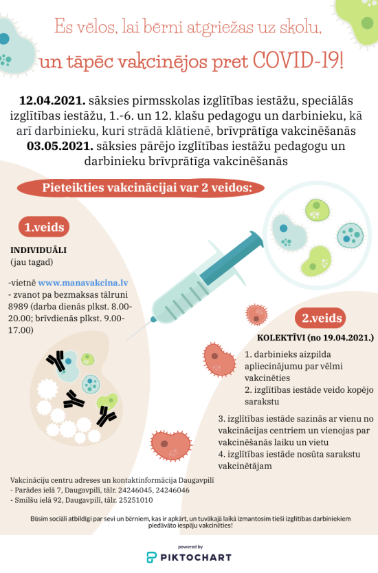Vakcinācija ir labākais veids, kā iegūt imunitāti pret slimībām, salīdzinājumā ar imunitāti, kas iegūta, saslimstot ar šo slimību. Vakcinācija neļauj cilvēkiem iegūt slimības simptomus, kas var būt smagi. Atšķirībā no citām zālēm, vakcīnas ir vienīgās, kas nevis ārstē saslimšanu, bet samazina iespējas saslimt ar noteiktām infekciju slimībām. Tieši tāpēc jau no š.g. 12. aprīļa Daugavpils pilsētas pirmsskolas izglītības iestāžu, speciālās izglītības iestāžu, skolu 1.-6. un 12. klašu pedagogiem un darbiniekiem, kā arī tiem darbiniekiem, kuri strādā klātienē, bet no 3. maija arī pārējo izglītības iestāžu pedagogiem un darbiniekiem tiks piedāvāta iespēja vakcinēties. Ievērojot brīvprātības principu, to varēs izdarīt gan individuāli, gan kolektīvi (skatīties zemāk infografiku).
