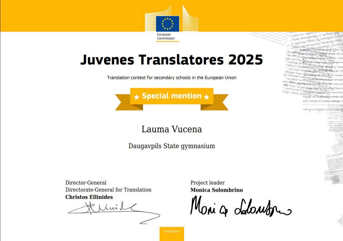 Eiropas Savienības jauno tulkotāju konkursā vidusskolēniem “Juvenes Translatores” Eiropas Komisija šogad paziņoja 27 uzvarētājus – pa vienam no katras valsts. Latvijā 29 skolēnu konkurencē uzvaras laurus plūca Itas Kozakēvičas Rīgas Poļu vidusskolas skolniece Nikole Luberacka, kura tulkoja tekstu no latviešu valodas poļu valodā. Atzinības raksti piešķirti Laumai Vucenai no Daugavpils Valsts ģimnāzijas un Annikei Sprūdei no Nīcas vidusskolas.