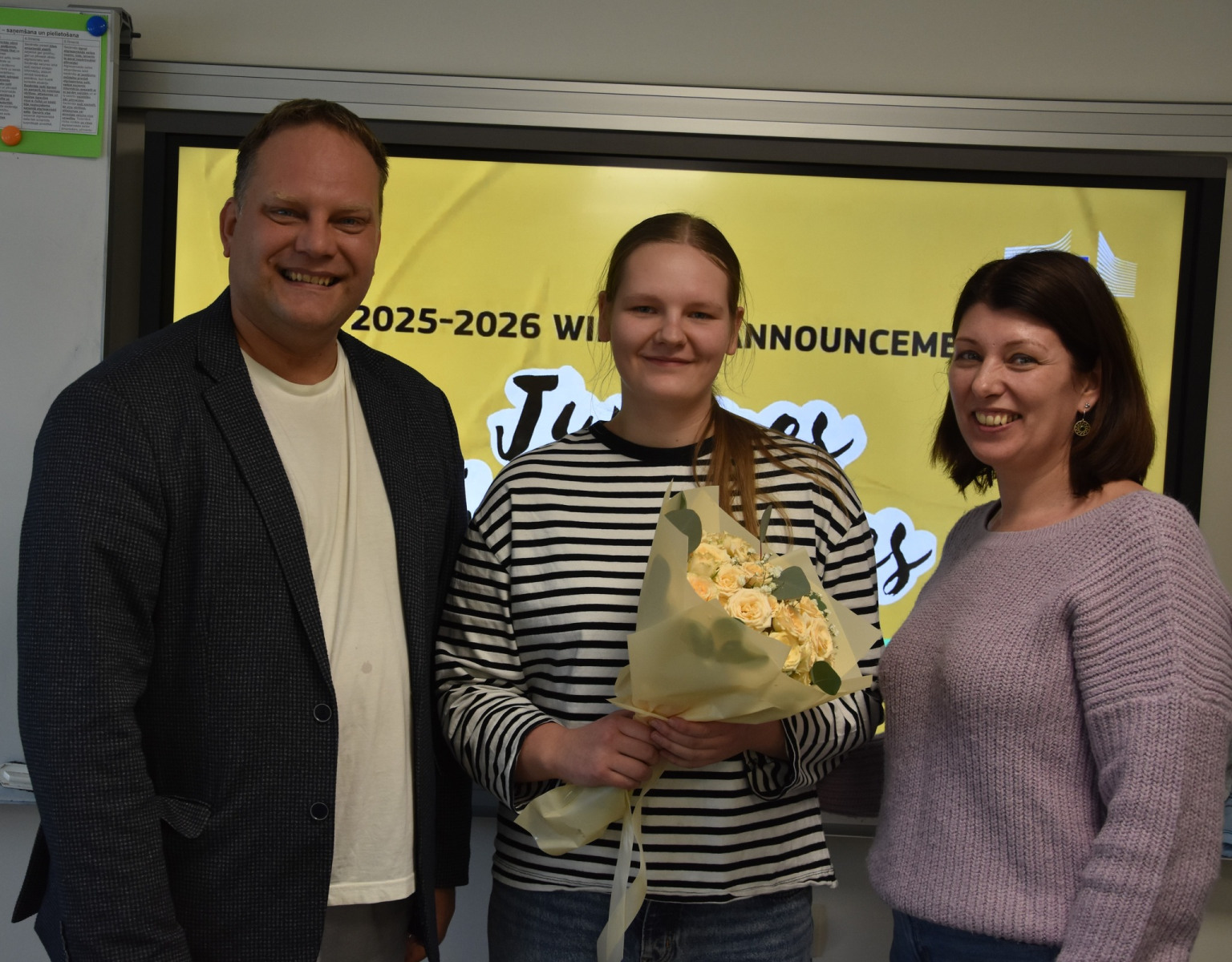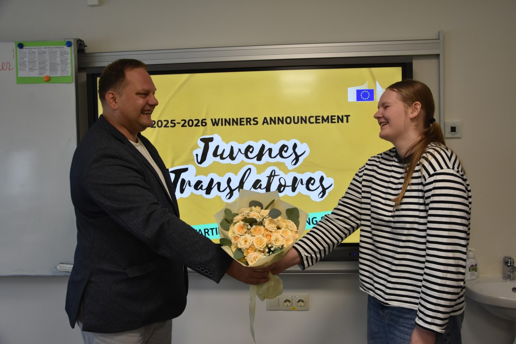 Ar skaistu rožu pušķi rokās Daugavpils Valsts ģimnāziju apmeklēja Europe Direct Latgale vadītājs Oskars Zuģickis, lai godinātu ģimnāzisti Laumu Vucenu un viņas skolotāju Ritu Murāni-Rutku. Lauma saņēma “Juvenes Translatores” īpašo atzinību, un mēs no sirds lepojamies ar viņas sasniegumu, kā arī sakām lielu paldies skolotājai par nenogurstošu entuziasmu un ieguldījumu konkursa norisē ģimnāzijā.