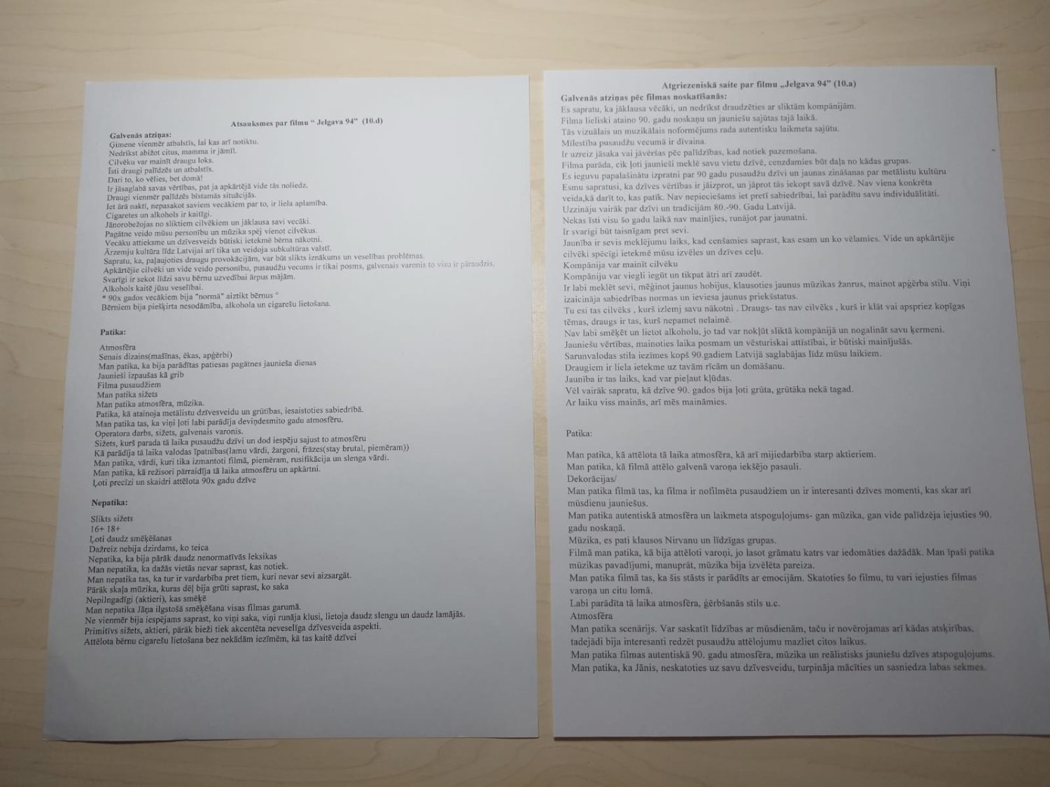 Jaunieši atzina, ka filma ļauj izjust tā laika atmosfēru un izprast jauniešu dzīvi 90.gadu Latvijā. Viņi atzīst, ka jaunība ir sevis meklējumu laiks, kad ikviens cenšas izprast, kas viņš ir un ko vēlas; apkārtējā vide un cilvēki spēcīgi ietekmē jauniešu izvēles un dzīves ceļu. Šajā laikā posmā ir svarīgi būt godīgam pret sevi, apzināties vērtības, ko piekopt un ieklausīties vecāku sniegtajos padomos. /Līga Saleniece/