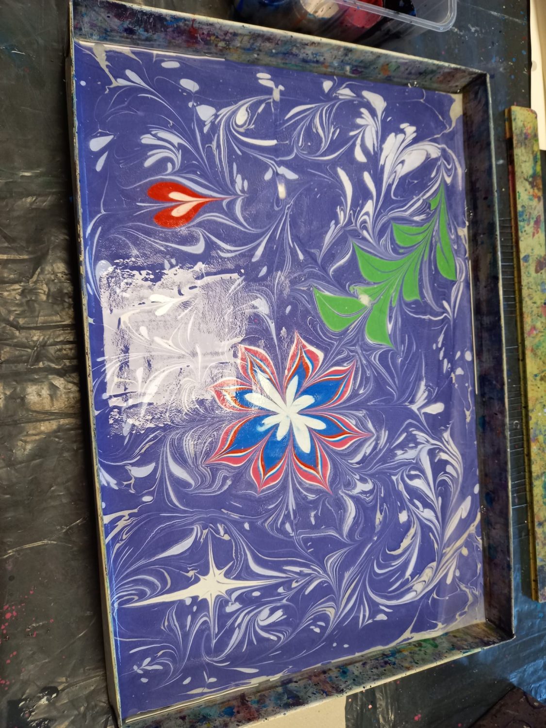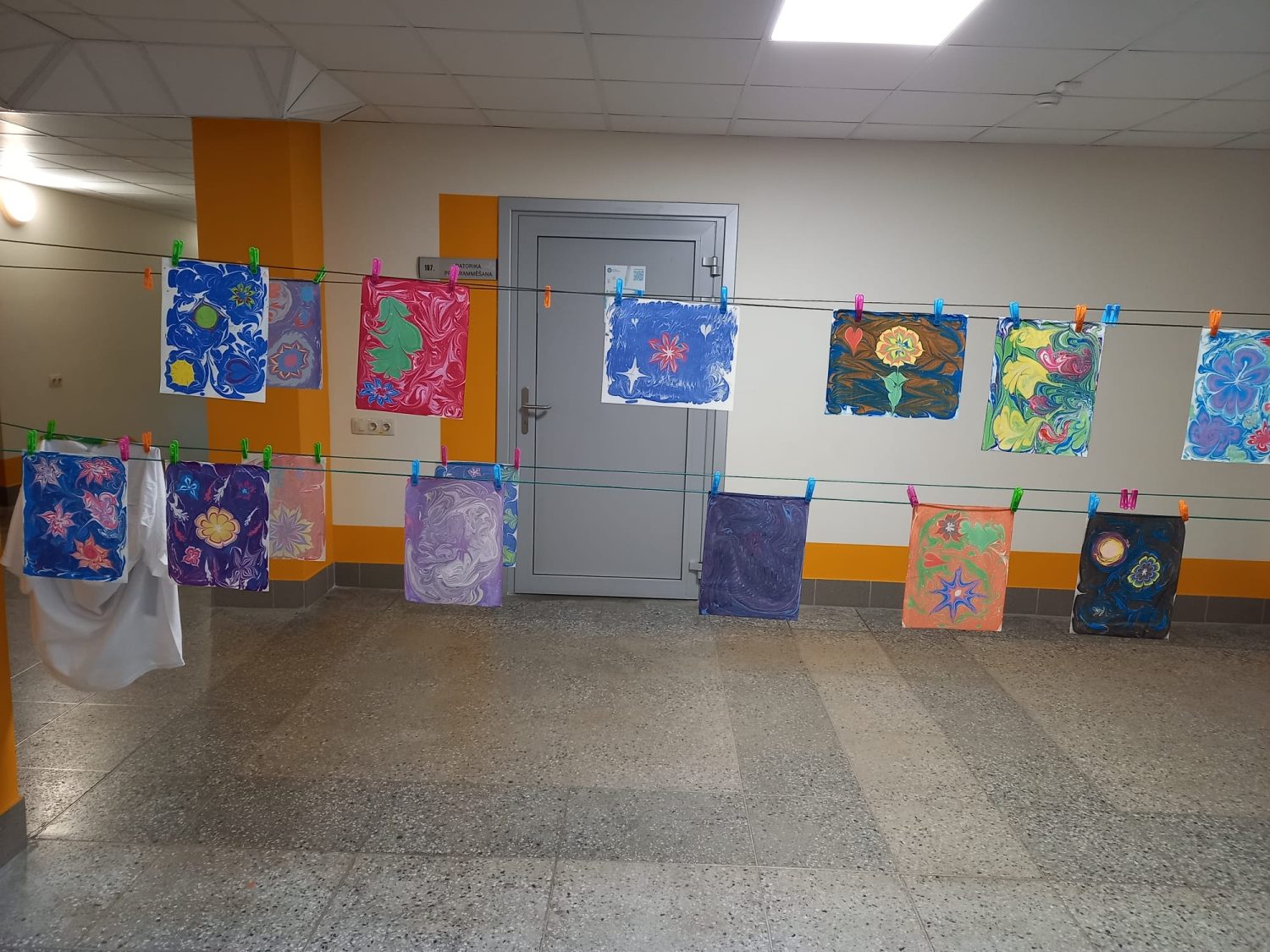 “02.05.2024. viena mācību stunda bija veltīta ebru mākslas izpētīšanai un izmēģināšanai. Šī pasākuma mērķis bija ļaut skolēniem brīvi izpaust savu radošumu, veidojot dažādus abstraktus un krāšņus dizainus, kā arī sniegt informāciju par šo gleznošanas tehniku. Tas ir neaprakstāmi skaists un neparasts glezniecības veids, kad krāsa tiek pludināta uz īpaši sagatavotas ūdens virsmas, veidojot rakstus un zīmējumus, kurus vēlāk var pārnest uz papīra vai auduma. Tēlaini šī māksla tiek dēvēta par sirds melodijas attēlošanu uz ūdens. Es pirmo reizi